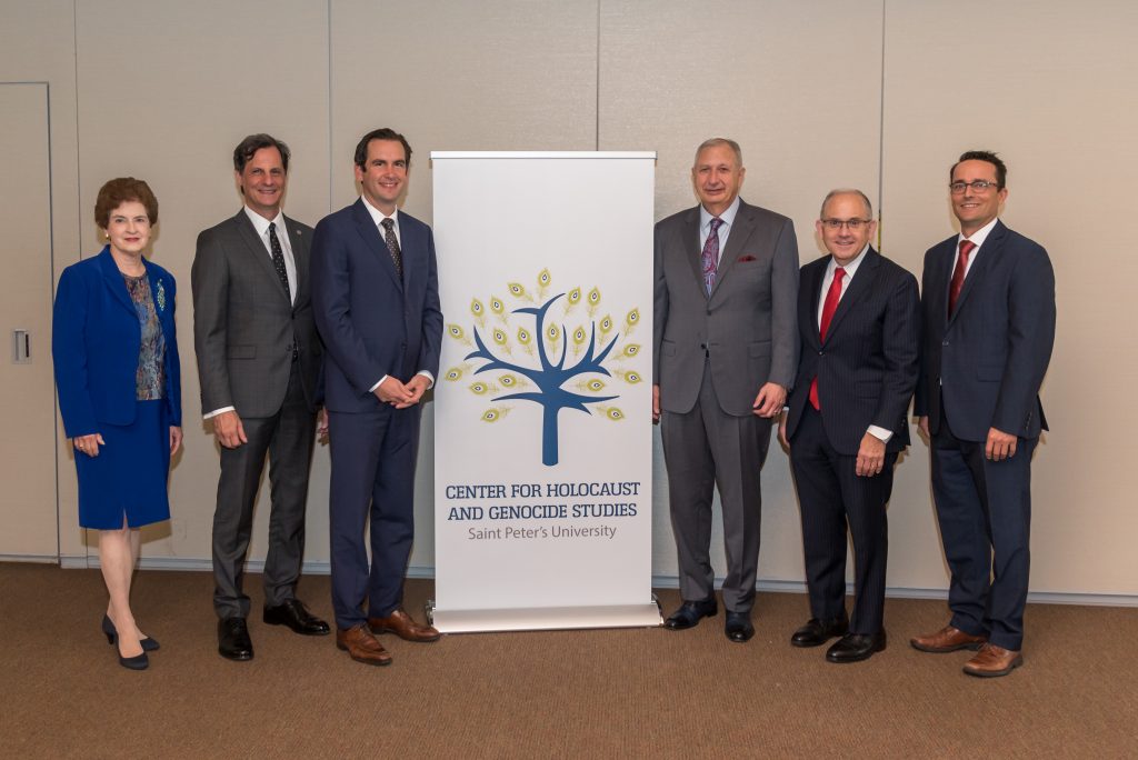 Pictured from left: Eileen L. Poiani, Ph.D., special assistant to the president; Frederick Bonato, Ph.D., provost and vice president for academic affairs; Jersey City Mayor Steven Fulop H ’14 ; Joseph A. Panepinto, Esq. ’66, president and chief executive officer of Jersey City-based Panepinto Properties and a member of the Saint Peter’s Board of Trustees; Eugene J. Cornacchia, Ph.D., president of Saint Peter’s University; and David Gerlach, Ph.D., director of the Center for Holocaust and Genocide Studies.