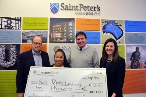 Paloma De Leon, assistant vice president and Jersey City branch manager for Investors Bank, awards $10,000 to Joseph Gilkey, executive director of the Ignite Institute of Saint Peter’s University, for The Institute’s Entrepreneurs in Residence Program.