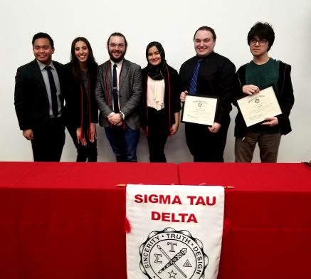 On April 3, the English Department held its annual induction to Sigma Tau Delta, the International English Honor Society. Pictured here, left to right, are alumnus Patrick Caoile (’18), seniors Khawla Elharmouchi, Nicholas Dawybida, and Mahreen Shahzadi, and new inductees Matthew Blumensteel and Kevin Rojas (Class of 2020).