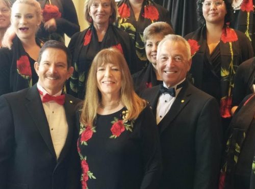 Photo, from left: Composer James Adler, Lyricist Debra Harden Rue, Dr. Jerome Bierschenk and members of the Sigma Alpha Iota Convention chorus.