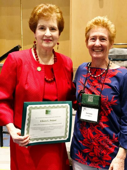 The Association for Women in Mathematics (AWM) inducted Eileen L. Poiani, Ph.D., professor of mathematics, as a Fellow of AWM. This induction is for her sustained commitment to encouraging individuals at all educational levels to pursue their study of mathematics. Pictured is Dr. Poiani (left) with Ruth Haas, Ph.D., president of AWM, at the Joint Mathematics Meetings in Denver for the presentation of the honor.