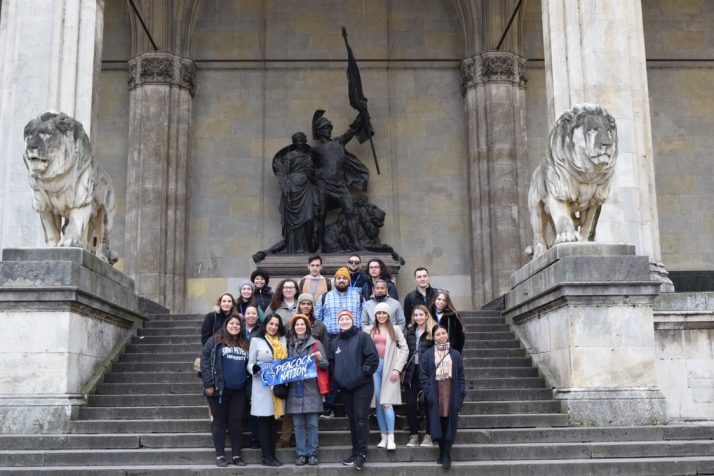 - PL-495 Exploring Philosophy Overseas and BL-495 Exploring Business Law Overseas students with their professors, Lisa O’Neill Sanders, Ph.D., and Lori Buza, J.D show their Peacock Pride at Feldherrnhalle (Field Marshals’ Hall) in Munich. The statue behind them was added to the monument in 1892, after the Franco-Prussian War, and represents the victory over the French and the unification of Germany.