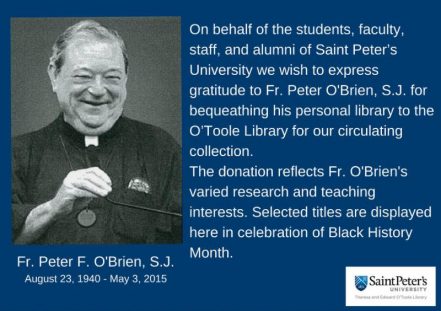 Throughout the month of February, The Theresa and Edward O’Toole Library is highlighting a collection of books donated by Rev. Peter O’Brien, S.J., who taught in the English department. The major focus is on African American literature and music.For additional information please contact Ilona MacNamara.