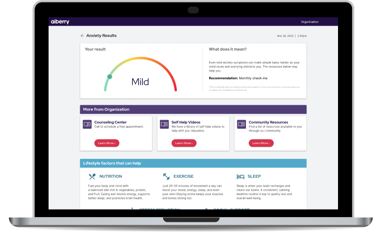 Anonymous, Confidential and FREE. Aiberry screening tools cover a variety of mental health and wellness issues; for those unsure where to start, take their general well-being screening. Although these screens are informational and not diagnostic, they provide a convenient opportunity to evaluate if you or someone you care about should connect with a behavioral health professional for a more thorough assessment.