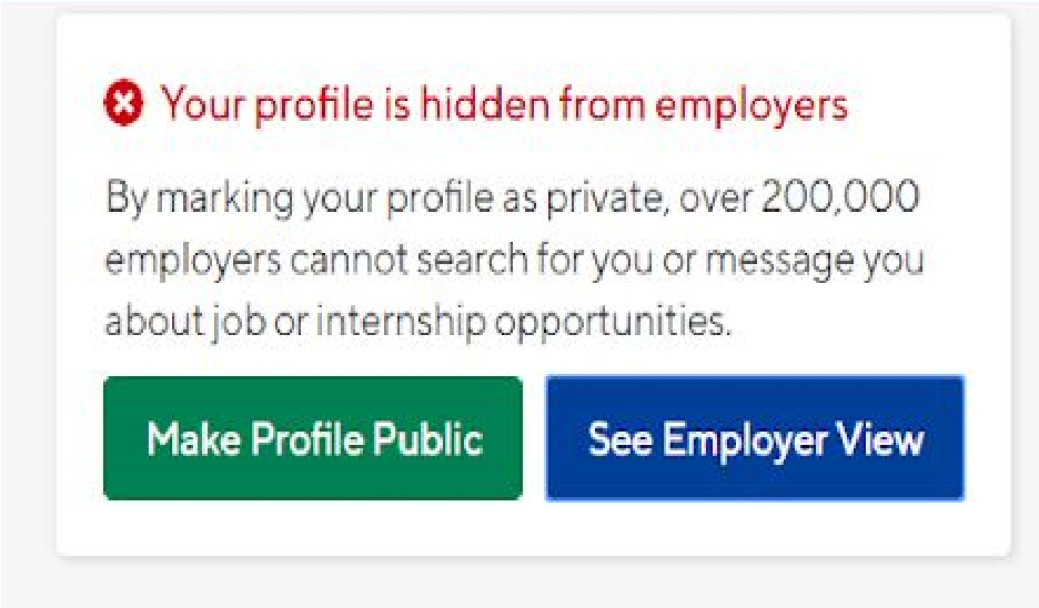 4. Make Your Profile Public to Employers on the right hand side of Student Profile, Handshake will indicate if your profile is private and cannot be seen by Employers.