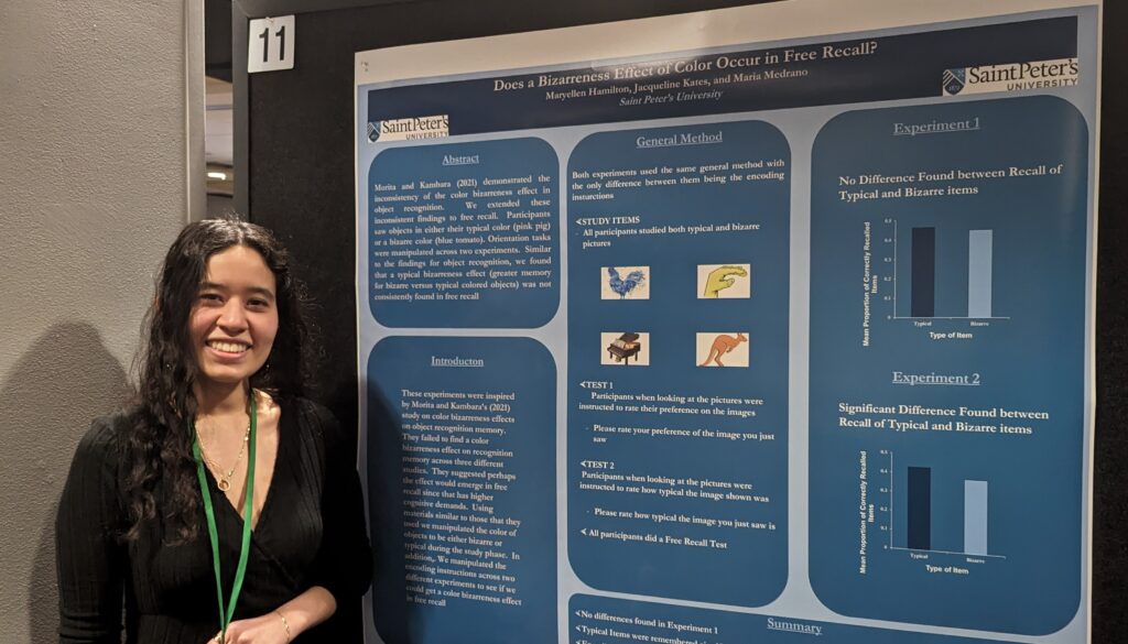 Maria Medrano, Sophomore Psychology Major, worked on a study done on the bizarreness effect. The project was on whether or not a bizarreness effect on color occurred in Free Recall.