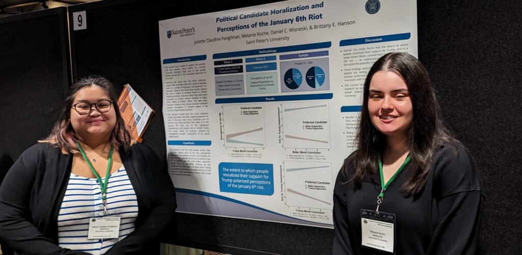 Four students presented posters at the conference. Ramona Urrutia presented a poster titled “Exploring the Role of the 2020 Election, the January 6th Riots, and Attributions of Blame in Moralization/Demoralization.” Juliette Pangilinan and Melanie Roche presented a poster entitled “Political Candidate Moralization and Perceptions of the January 6th Riot” and Maria Medrano presented a poster entitled “Does a Bizarreness Effect of Color Occur in Free Recall?”
