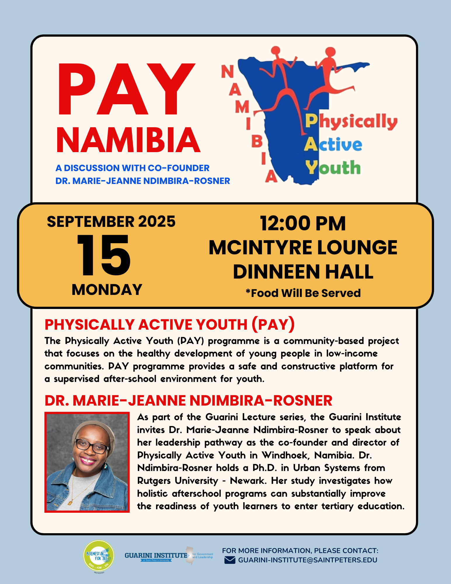 As part of the Guarini Lecture Series, the Guarini Institute invites Dr. Marie-Jeanne Ndimbria-Rosner to speak about her leadership pathway tot he founding of Physically Active Youth, an after-school program in Windhoek, Namibia that provides academic assistance, life skills and sports to help youth learning in low-income communities gain access to tertiary education.