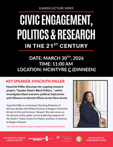 Hyacinth Miller discusses her ongoing research project, “Garden State’s Black Politics”, which investigates Black women’s political trajectories and influence in elected offices across New Jersey. Date: March 30, 2026 Location: McIntyre C, Dinneen Hall