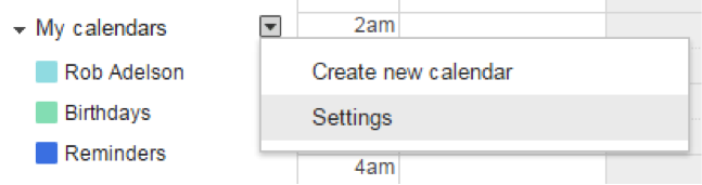 - In Google Calendar, click the dropdown next to “My Calendars” and select “Settings”.