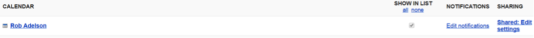 - Locate your calendar, and to the right, click where it says “Shared: Edit Settings”