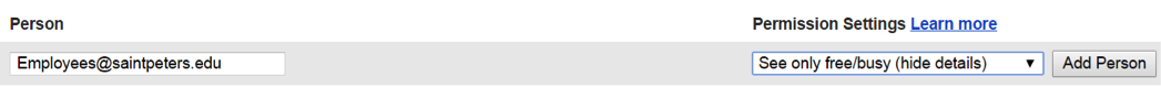 Below this section , you will see that you are able to share your calendar with groups or individuals. Simply type in the name of each group or individual that you’d like to share with, and set what level of access you’d like them to have – for example, if you want all Employees (Faculty, Staff, and Administrators, but not students) to see “Only Free/Busy”, paste the email address “employees@saintpeters.edu” into the “Enter email address” field, set it to “See only Free/Busy” and then click “Add Person”: