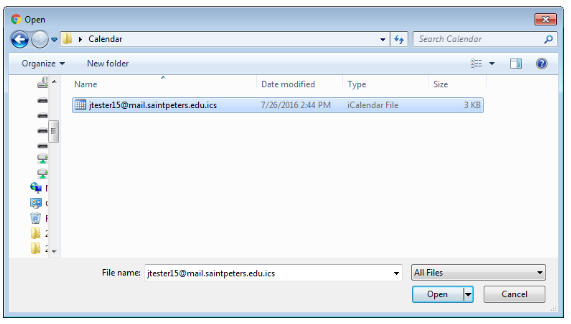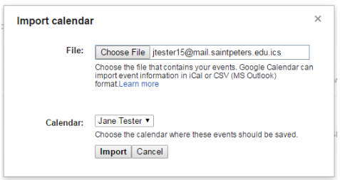 - Click “Choose File” and select the Calendar file within the Calendar Folder that you just exported – it should be in .ics format.