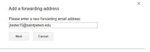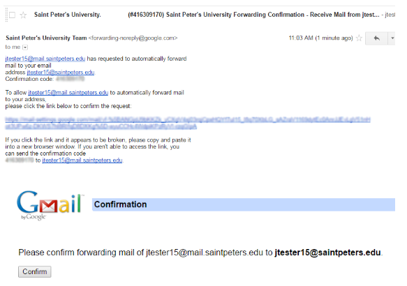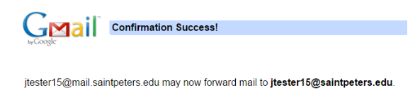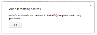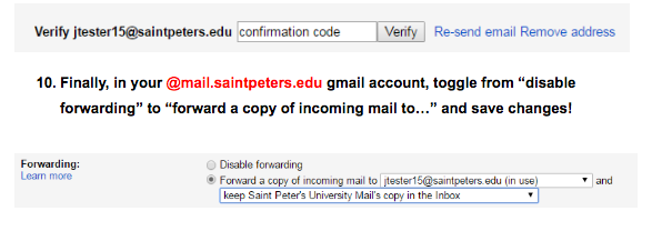 - Go back to your @mail.saintpeters.edu Account (The one which you chose to send forwarded emails FROM). If you confirmed in step 8 via the link in your email, skip to step 10. if you did not click the link, you will see “Verify (new email address).” Paste the confirmation code in the box, and click “Verify”.