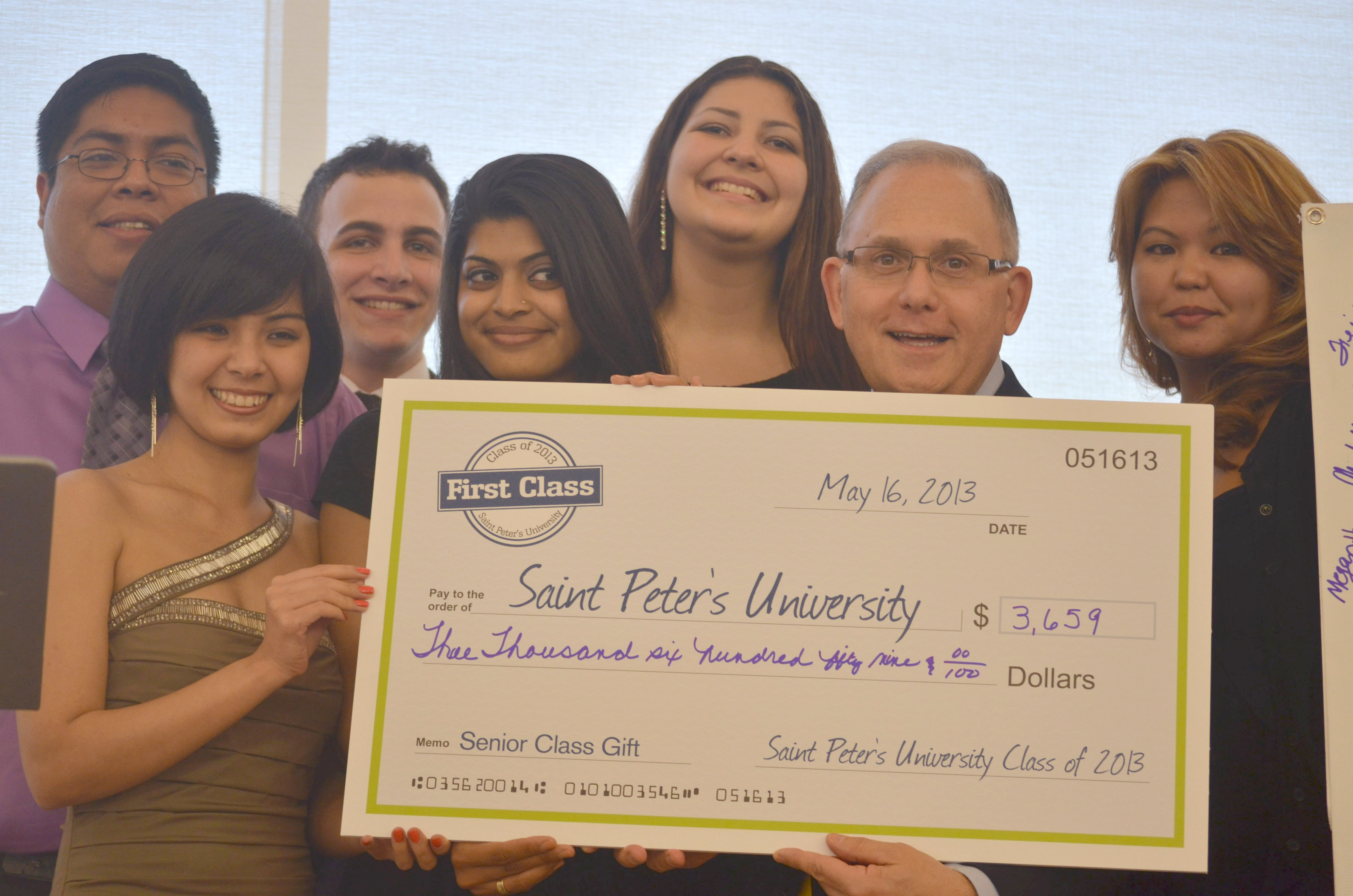 As a cap-off to the night’s festivities, Senior Class Gift Advancement Ambassadors and presented University President Eugene J. Cornacchia, Ph.D., with a check of $3,659 for the Senior Class Gift. The amount was raised from 254 contributions, including an annual Senior Class Gift commitment from Anne Butler ’69. Due to this generosity, last year’s total of 198 donors and $3,183 was surpassed, making the Class of 2013 the largest contributors to the Senior Class Gift in Saint Peter’s history.