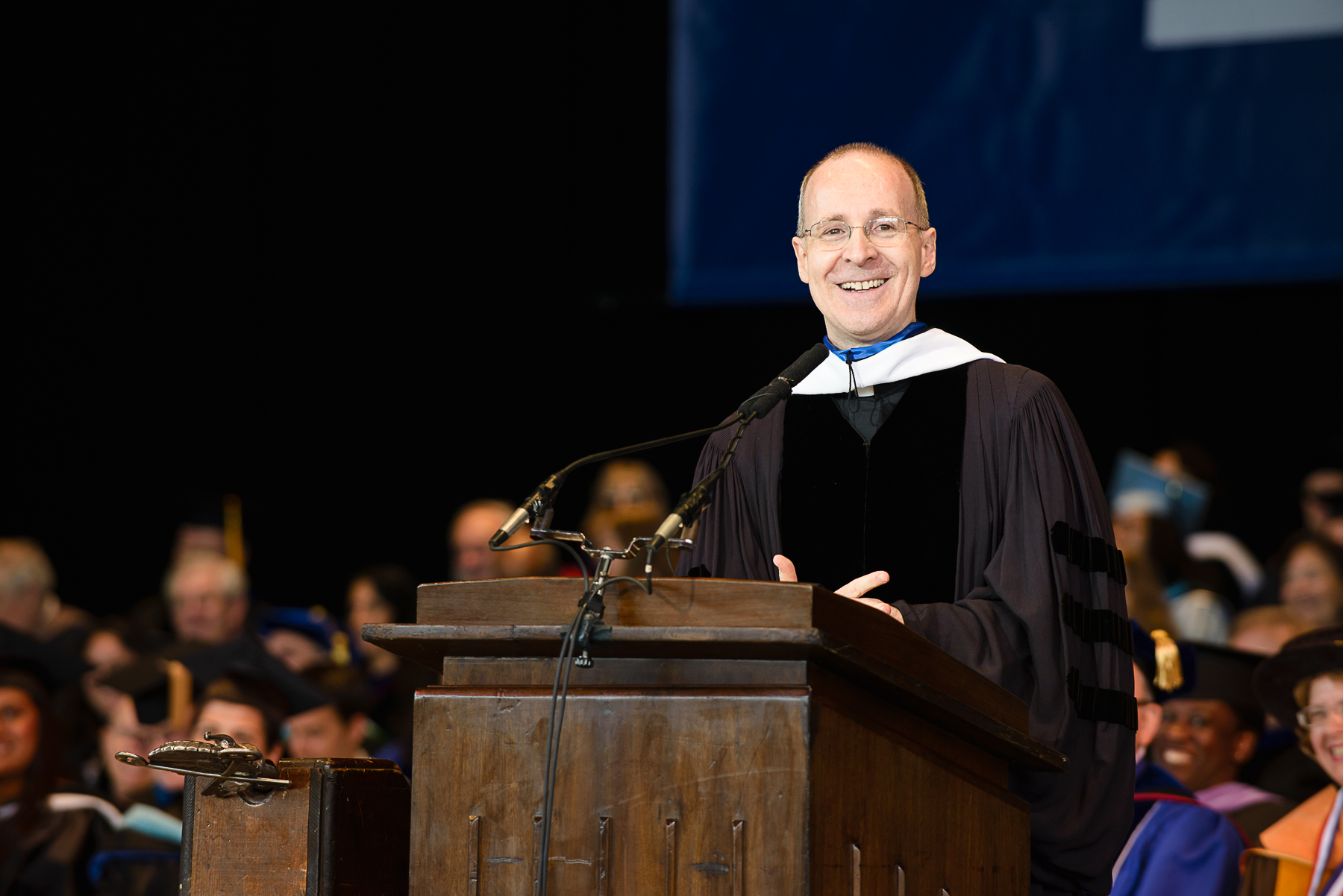 The first pieces of advice came from the commencement speaker, Rev. James Martin, S.J., editor of America Magazine and best-selling author. Fr. Martin is the author of many books, including The Jesuit Guide to (Almost) Everything, My Life with the Saints, and Between Heaven and Mirth, among others. His commentary in the national and international media is well known and he has appeared on all major radio and television networks. His advice to the Class of 2013 was to lighten up and laugh at yourself. “Humor and laughter have often been deemed inappropriate in religious settings, but when you are deadly serious, you are seriously dead. The great spiritual masters from every tradition knew the value of humor and laughter,” he said.