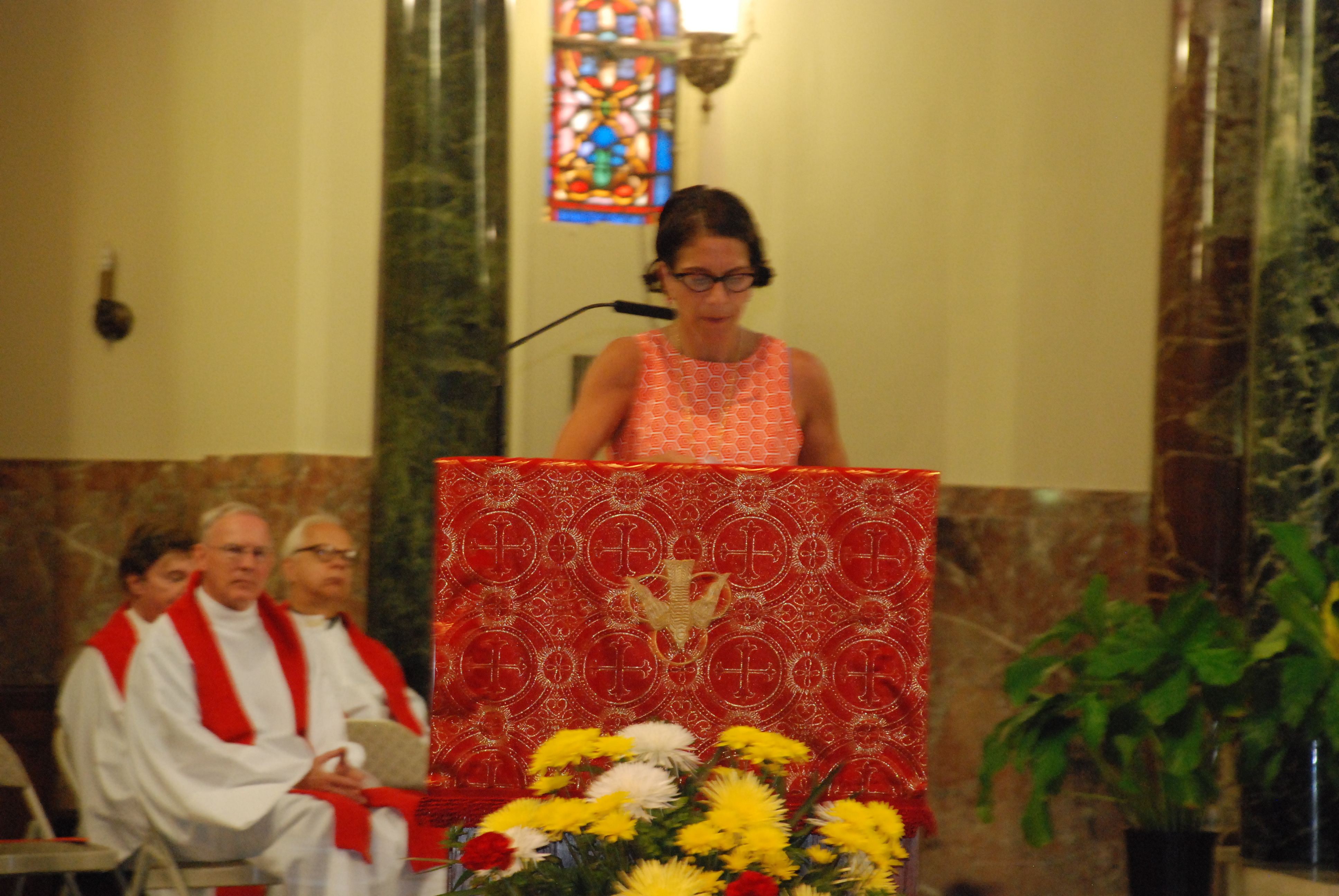 During the Mass, Associate Professor of Political Science Anna Brown, Ph.D., alumna Carmel Galasso ’79 and student Melissa-Ann Emmanuel ’16 presented their reflections on the gospel, often quoting Pope Francis and paying special attention to the Jesuit principles of Magis and cura personalis.