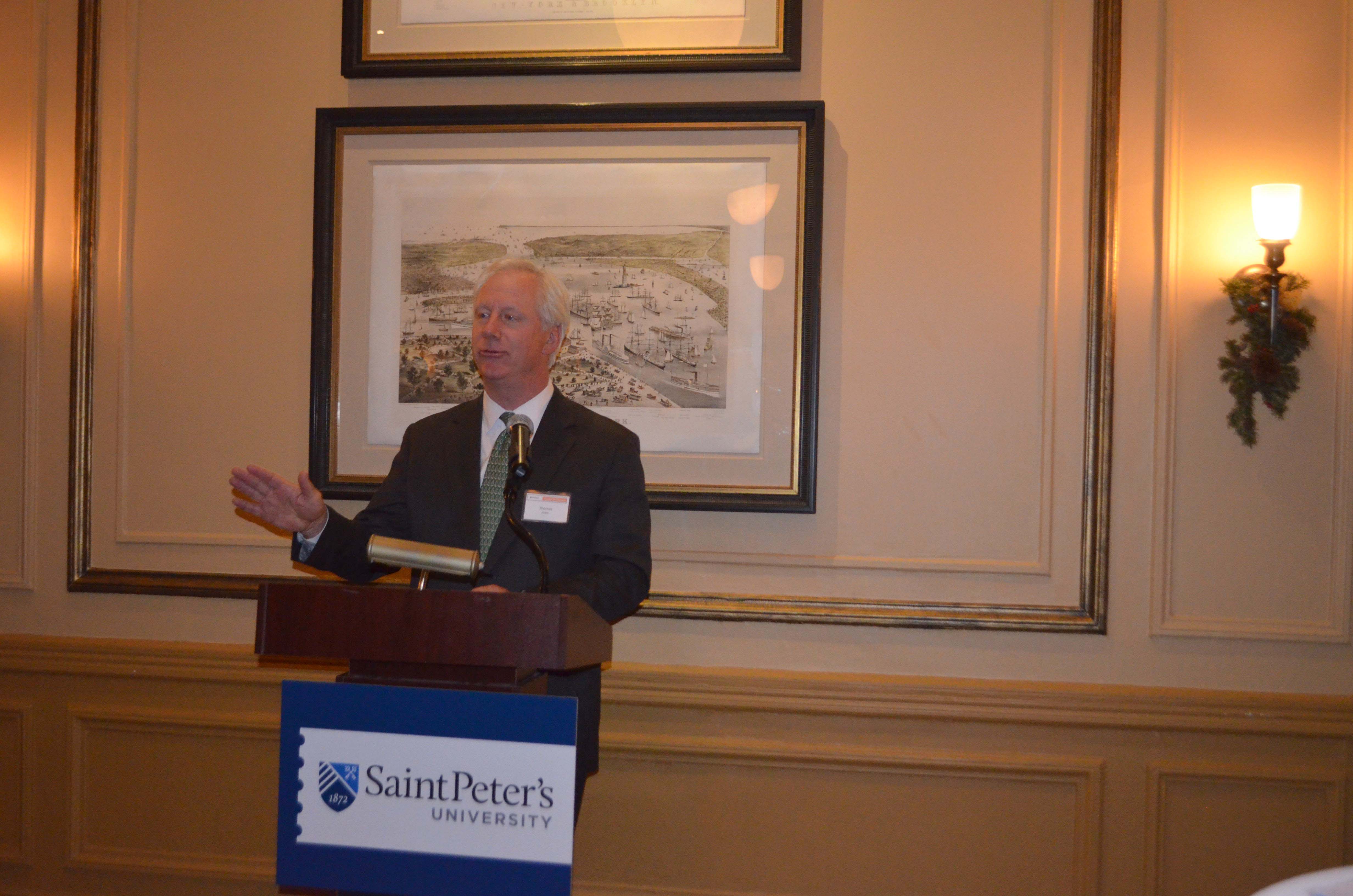 Saint Peter’s University alumni in the business and financial sector, as well as students interested in business management, gathered at the Down Town Association in New York for an Alumni in Finance (AiF) event on December 4. Thomas M. Joyce, former chairman and CEO of Knight Capital group, served as the guest speaker for those in attendance.