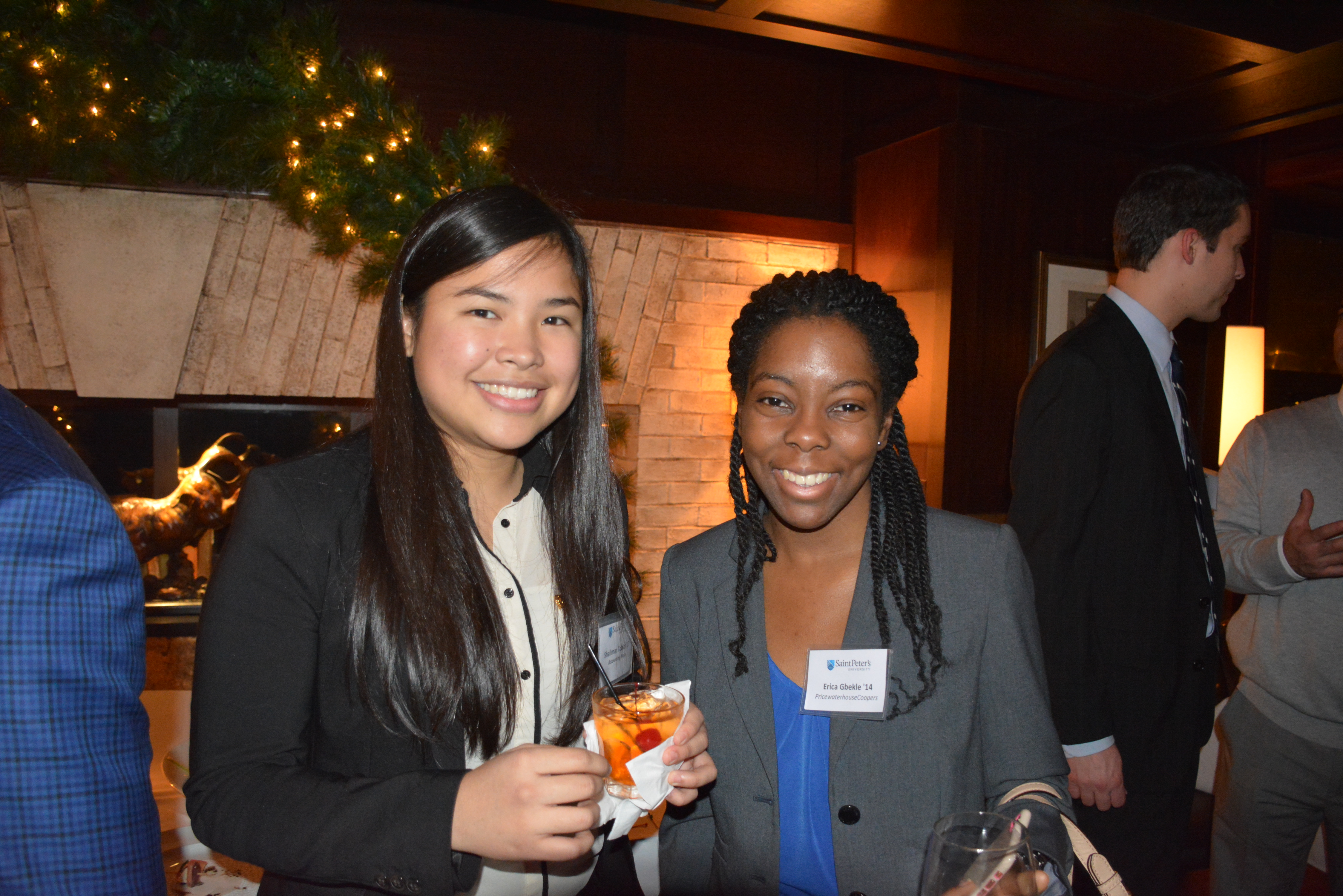 While many of the individuals had previously attended Alumni in Finance networking events, a great deal of alumni were there for the first time, such as Ali Hassan ’13, investment analyst at Goldman Sachs. Hassan decided to attend because he wanted to network with Saint Peter’s alumni who were seeking career opportunities and advice. As a former member of the Saint Peter’s University men’s swim team, Hassan launched Swim Academy, a private swimming consulting company. Through networking from his business, he connected with representatives from Goldman Sachs who helped him secure a full-time investment analyst position upon graduation.