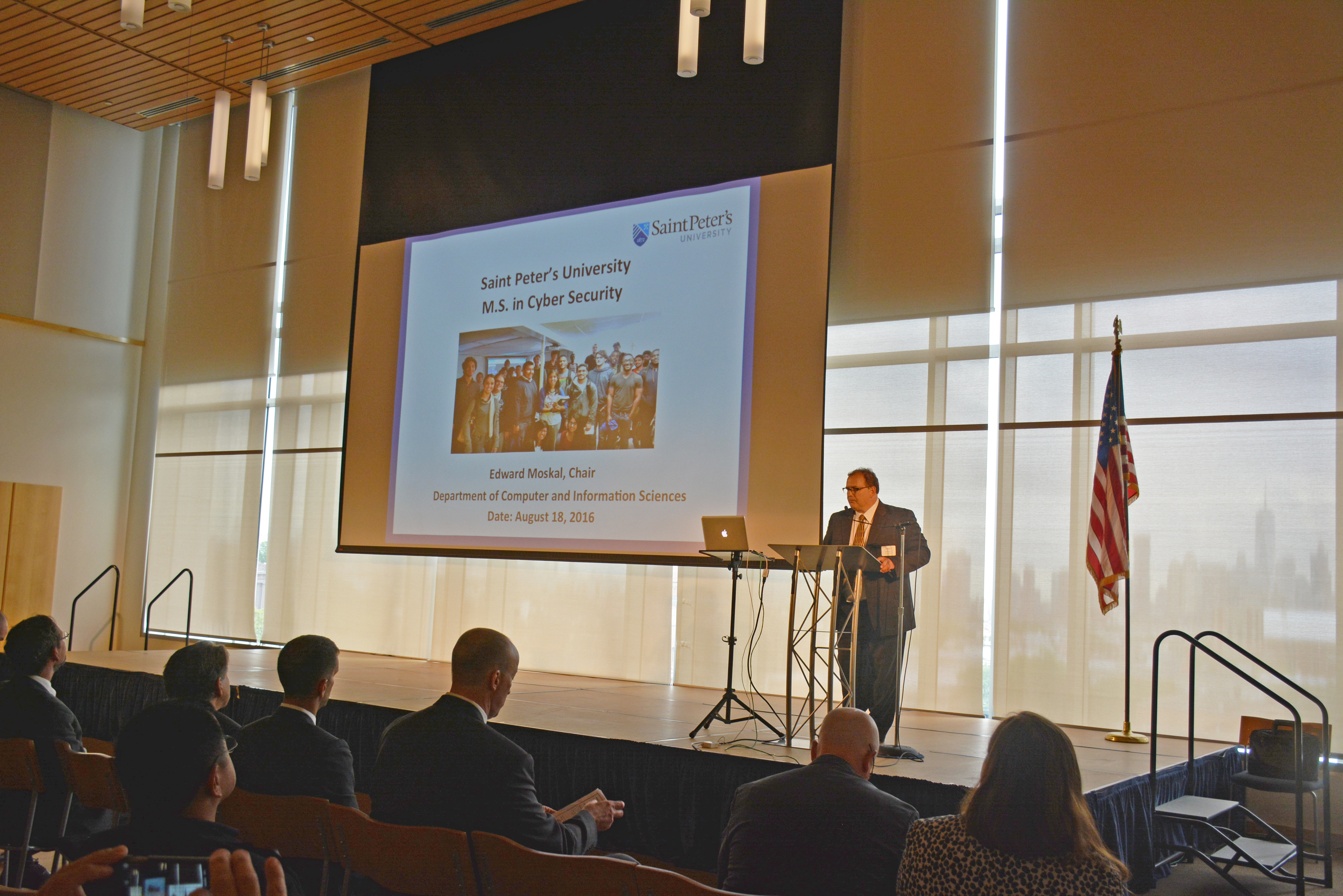 Edward Moskal, M.S., M.M.S., chair of the department of computer and information sciences at Saint Peter’s University and director of the master’s program in cyber security, gave a presentation at the event about the University’s current initiatives in the cyber security space. The initiatives include the development of the Cyber Security Center, a growing Cyber Security Club, successful internship placements for cyber security students at top companies, and an upcoming Cyber Security Case Study Competition with Kaspersky Lab and The Economist.