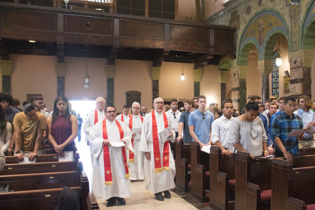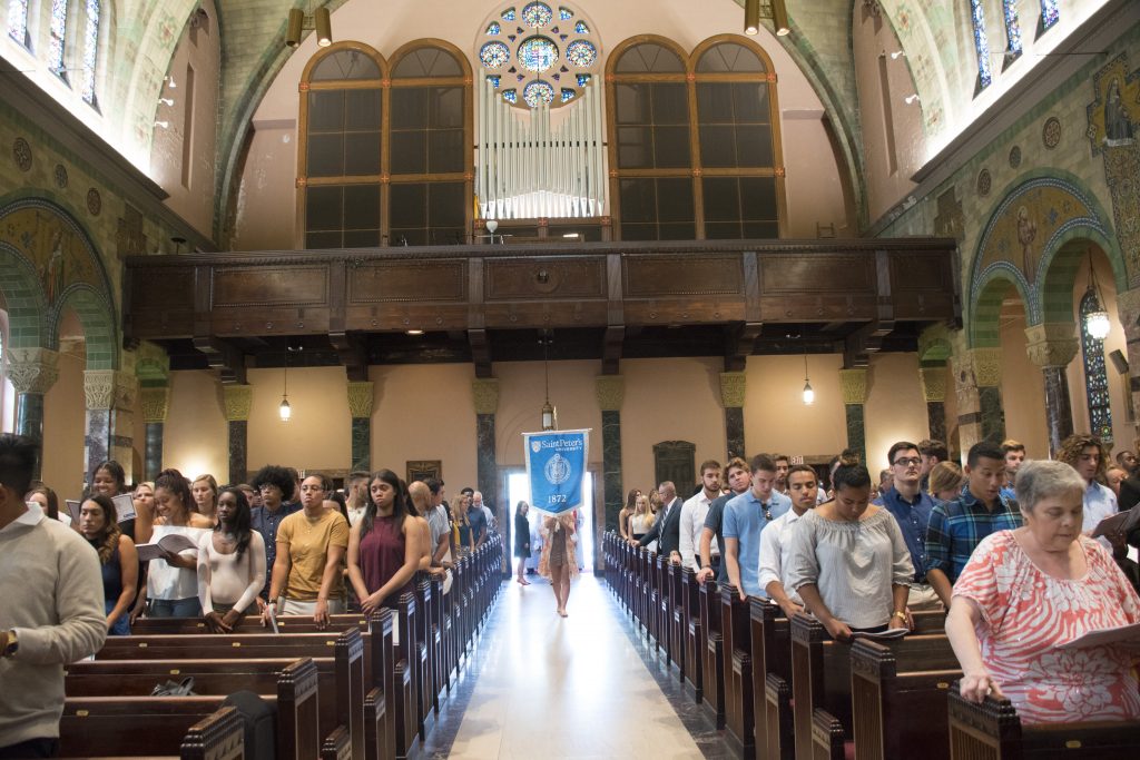 On Wednesday, the Saint Peter’s community came together at St. Aedan’s: The Saint Peter’s University Church to celebrate the Mass of The Holy Spirit. This ceremony, which dates back to the Middle Ages, marks the traditional start of the year at Jesuit schools around the world. The Mass was open to all members of the community. Music was provided by Joseph Legaspi, D.M., University music director, and SCHOLA, the University’s liturgical choir. Students, faculty and staff participated as greeters, lectors and Eucharistic ministers.