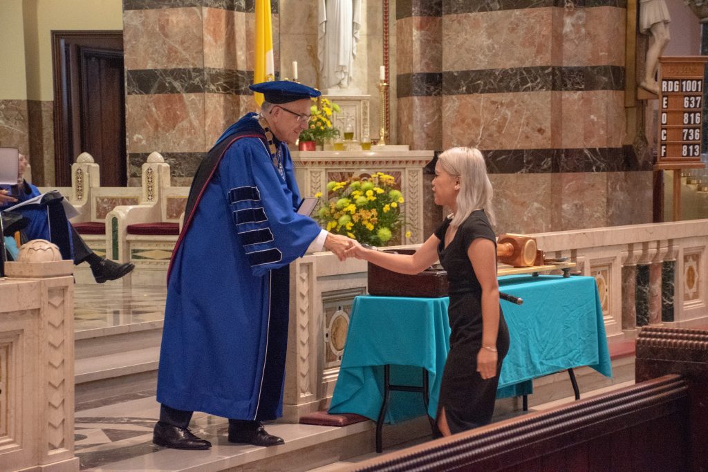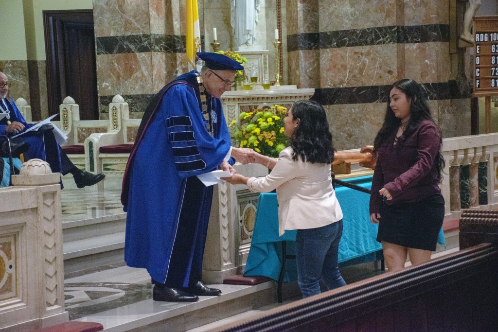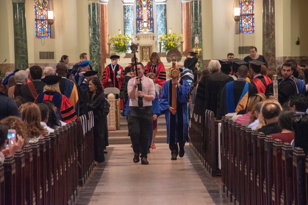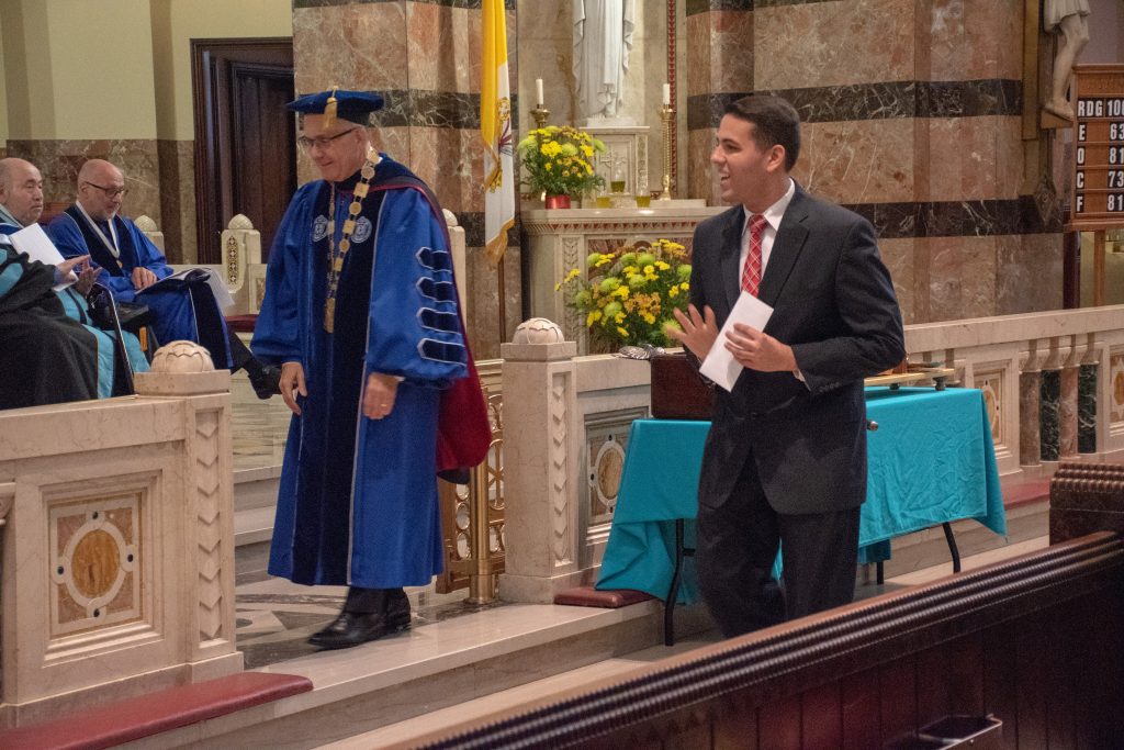 During the convocation, seniors are inducted into the oldest and most distinguished honors society at Saint Peter’s, the Most Noble Order of the Peacock (MNOP), for attaining the highest scholastic average in all courses throughout their first three years at the University. The students inducted into this year’s MNOP society were Nisharg Parikh ’19, Melanie Shiwkumar ’19, Newstein Chang ’19, Teresa Organisciak ’19, Madel Liquido ’19, Thu Anh Ly ’19, Douglas Nover ’19, Vanessa Fragiacomo ’19, Samuel Marcillo-Gomez ’19, Alexis O’Callahan ’19, Petra Calderon ’19 and Sabrina Hamdulla ’19. Many other students, including those in honor societies, were recognized.