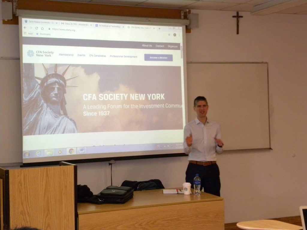 This year, 39 teams that represented 34 schools competed. The Saint Peter’s students were mentored by Enzo DiCostanzo, M.B.A., assistant clinical professor of economics and finance at Saint Peter’s University, chief economist at Pramana Capital and CFA Institute Research Challenge faculty advisor, and Ryan Sterling, CFA, industry mentor. The teams can be up to five students and all teams have a faculty advisor and an industry mentor. The teams conducted a deep dive research project on Cognizant, which is a technology company that helps companies innovate and update the way that they use technology. Ultimately, each team was responsible for analyzing management and legal risks of the company and they made suggestions on the value of stock. The teams presented their research in front of a panel of judges.
