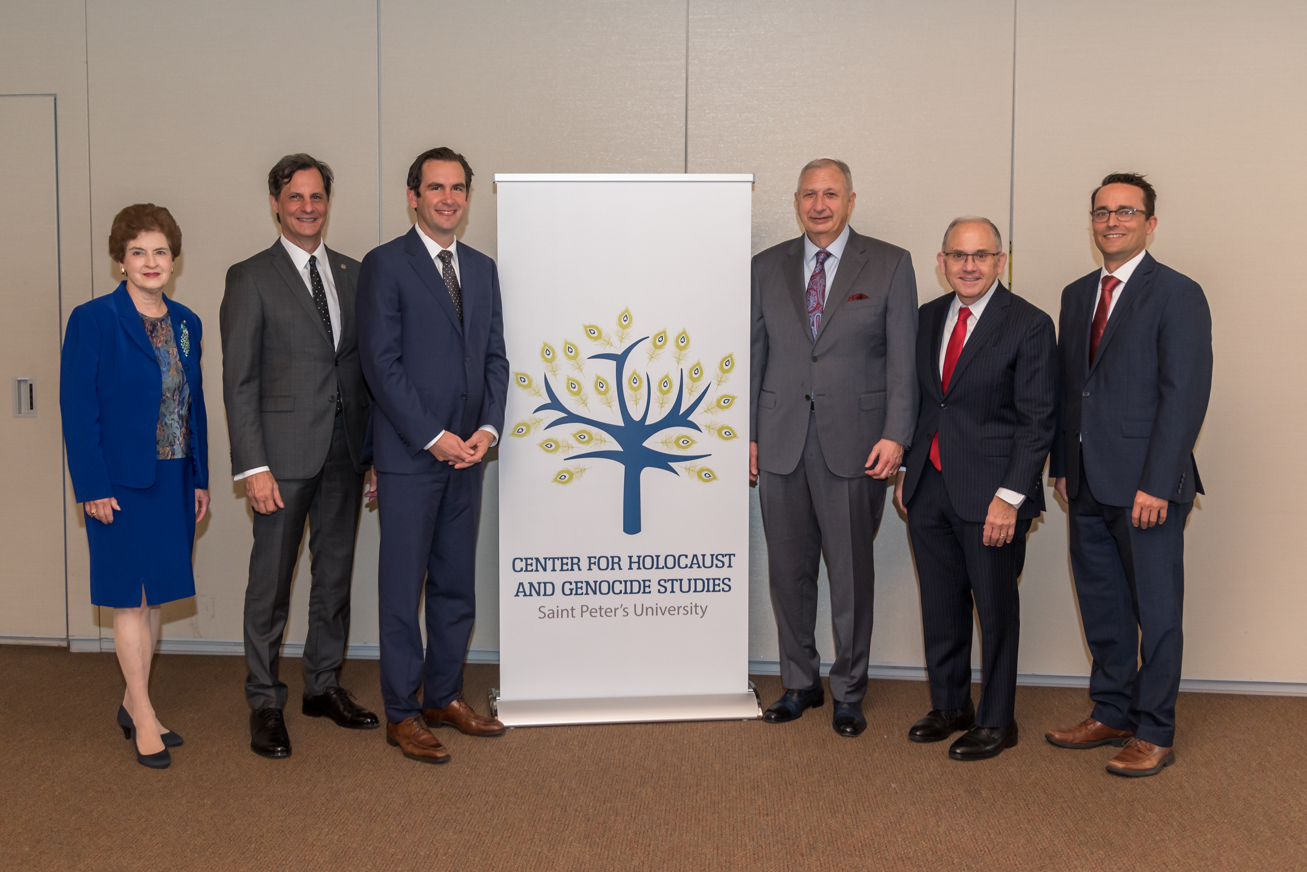 Pictured from left: Eileen L. Poiani, Ph.D., special assistant to the president; Frederick Bonato, Ph.D., provost and vice president for academic affairs; Jersey City Mayor Steven Fulop H ’14 ; Joseph A. Panepinto, Esq. ’66, president and chief executive officer of Jersey City-based Panepinto Properties and a member of the Saint Peter’s Board of Trustees; Eugene J. Cornacchia, Ph.D., president of Saint Peter’s University; and David Gerlach, Ph.D., director of the Center for Holocaust and Genocide Studies.