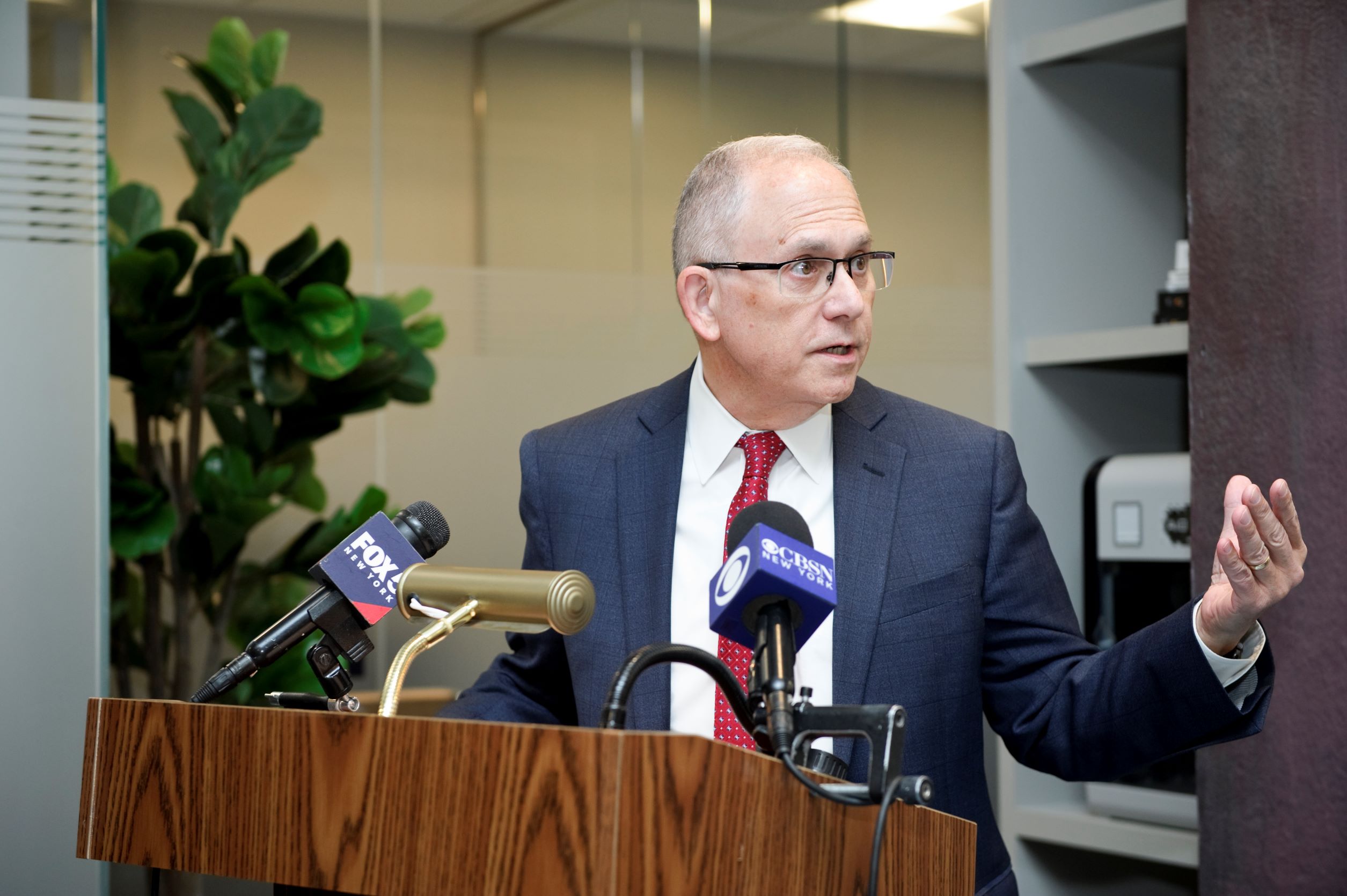 Saint Peter’s University President Eugene J. Cornacchia, Ph.D. speaking at the Mission 50 Innovation and Commercialization Lab ribbon-cutting. Photo credit: Marie Papp Photography.