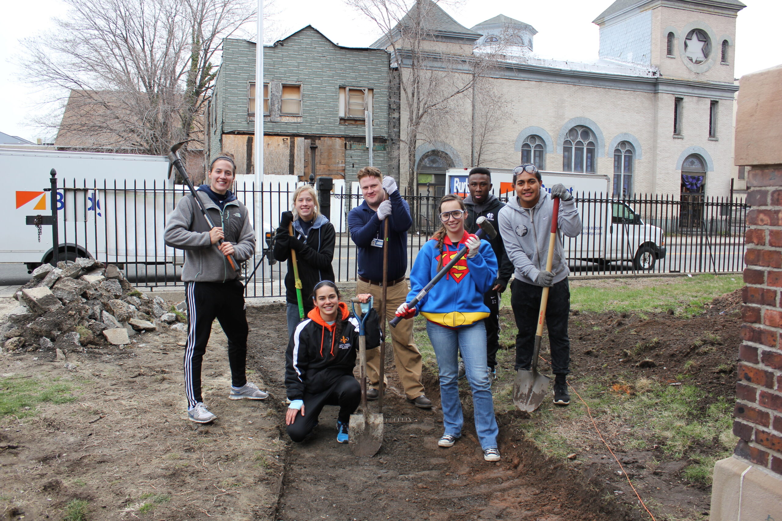 Saint Peter’s student volunteers along with Erich Sekel (center) working with Rebuilding Together in 2017.