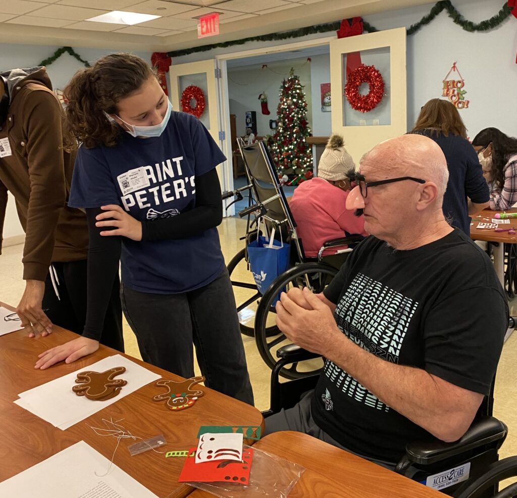 Students in Mary Anne Gallagher-Landi’s math class often discuss the Ignatian values and how they are relevant in the students’ lives. Each student then writes a letter to a nursing home resident about their personal stories to offer hope and inspiration. In the past the letters were dropped off, but this year several of the students brought the letters in-person to Peace Care Saint Joseph’s Nursing Home and led a holiday craft project.