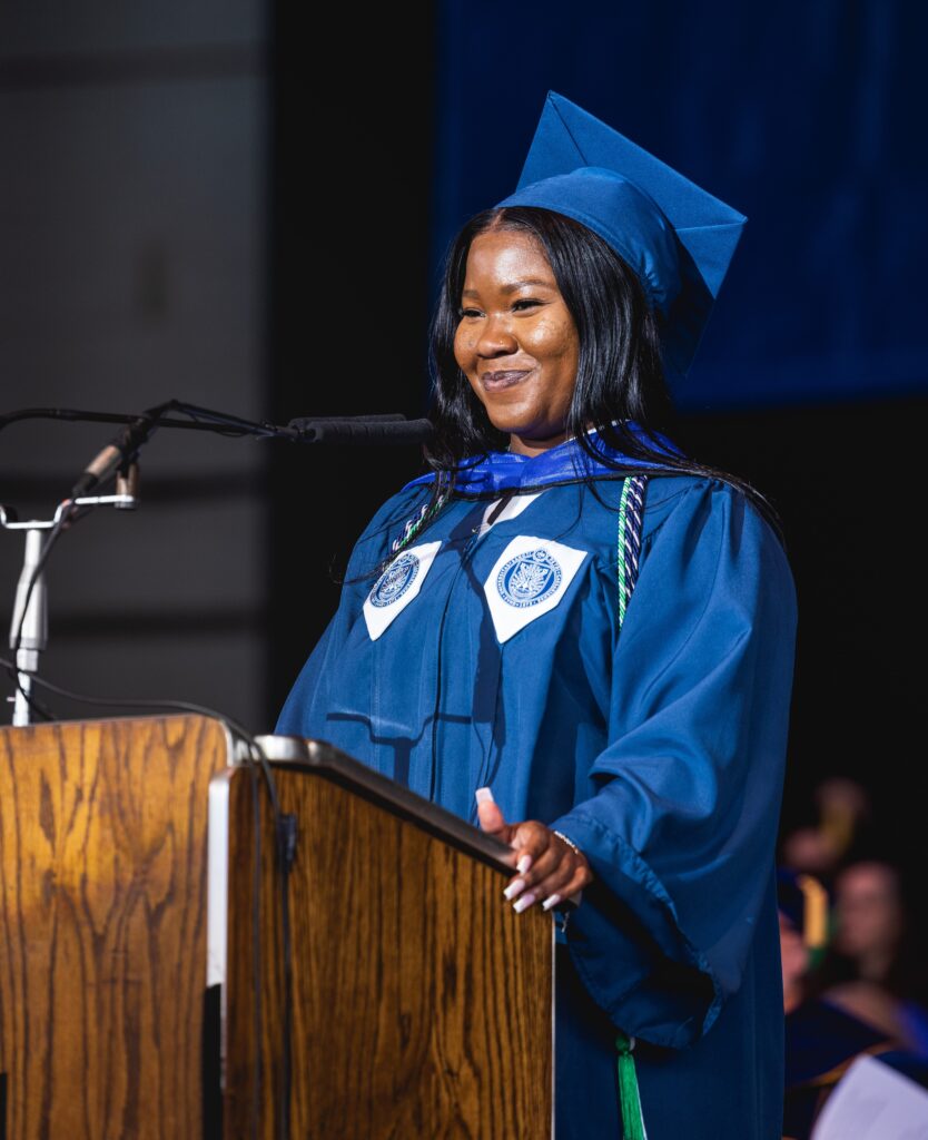 Witter reflected on the COVID pandemic challenges referring to her fellow classmates as the “Zoom class.” She went on to also share her experience of arriving on the Saint Peter’s campus. “On my first day on campus, it snowed. I am from the islands so everything was new to me, especially the cold. However, what struck me was the warmth that greeted me at McDermott, specifically the warmth of my professors. They were welcoming, top-notch in their field, passionate listening, lenient and nurturing.”