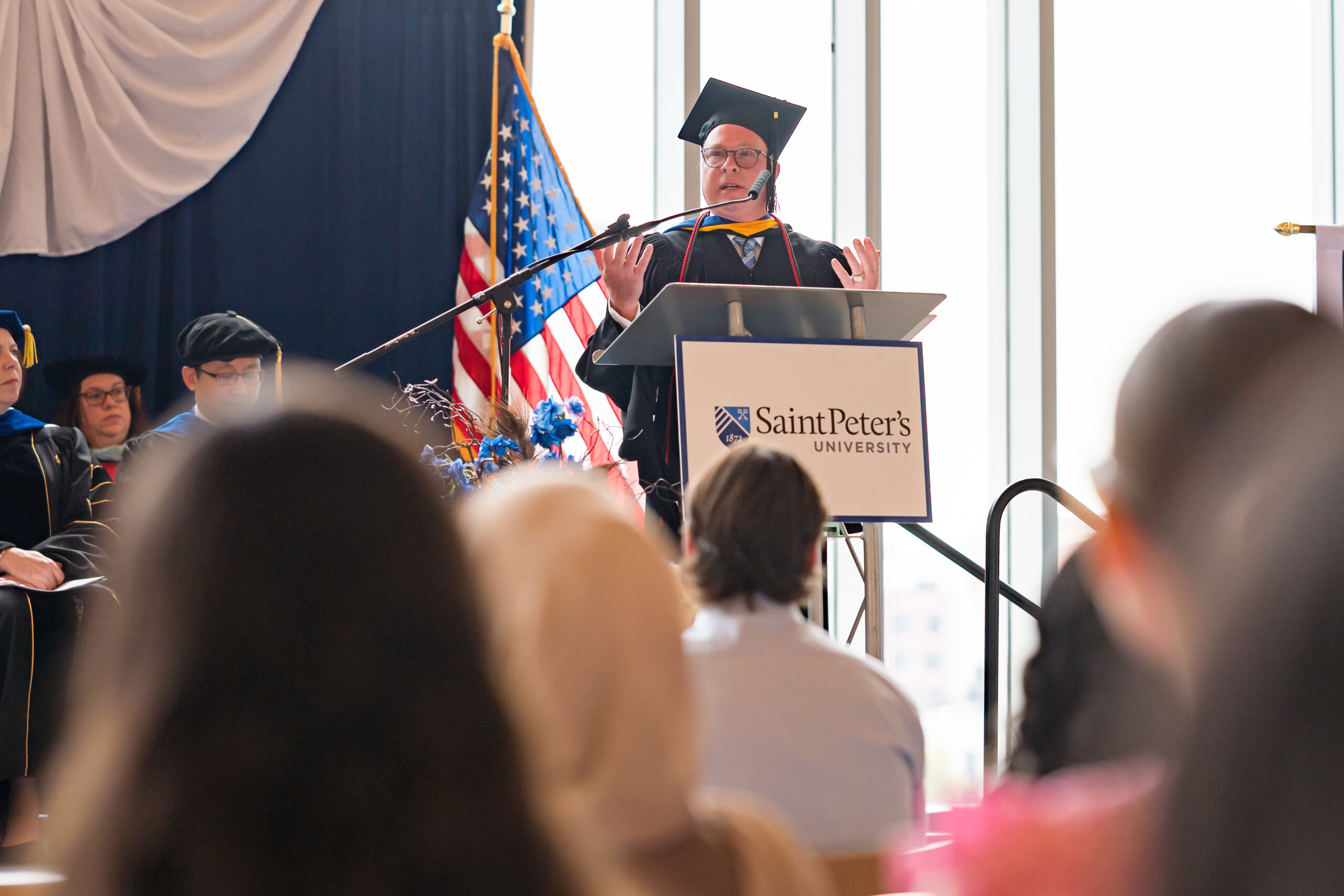 It was standing room only in The Duncan Family Skyroom on Wednesday, September 24, 2025 at Saint Peter’s University as students, faculty, staff and guests opened the academic year and celebrated student achievement with the 2025 Michaelmas Convocation. This year’s keynote speaker, Edward Hahn Jr., M.D. ’04, is Chief of the Division of Emergency Trauma in the Department of Plastic Surgery at Hackensack University Medical Center. He is also an assistant professor in the Department of Plastic Surgery at The Seton Hall – Hackensack Meridian School of Medicine. Dr. Hahn covered a number of topics as he spoke to the assembled crowd, from his humble upbringing that brought him to Saint Peter’s to acknowledging the faculty’s impact on students, which he sees first-hand teaching medical students and residents in training. He encouraged the students to dream big, be creative and practice kindness.