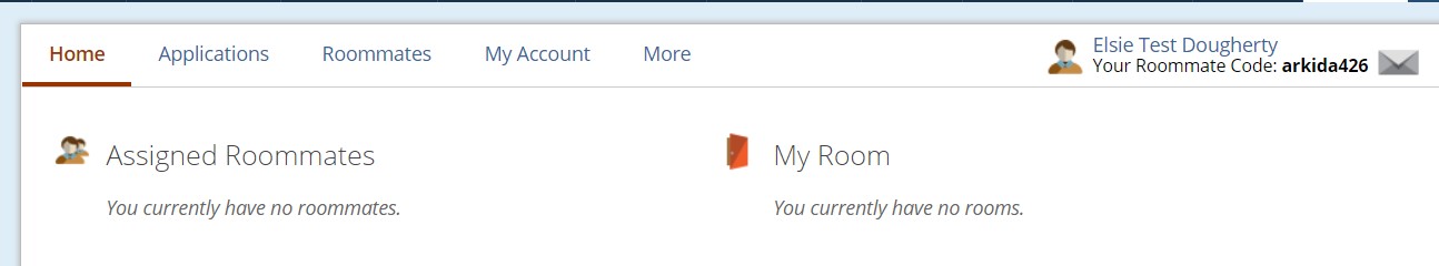 Students wishing to live together should form a group and delegate a group leader. All potential roommates should give their roommate code to the group leader. This allows the group leader to choose a room and roommates for all participants who share the code, so it should not be shared lightly. The roommate code is always displayed on the homepage of each student in the upper right-hand corner. To access the roommate section of the portal, click Roommates on the top menu bar and then select the appropriate academic term.